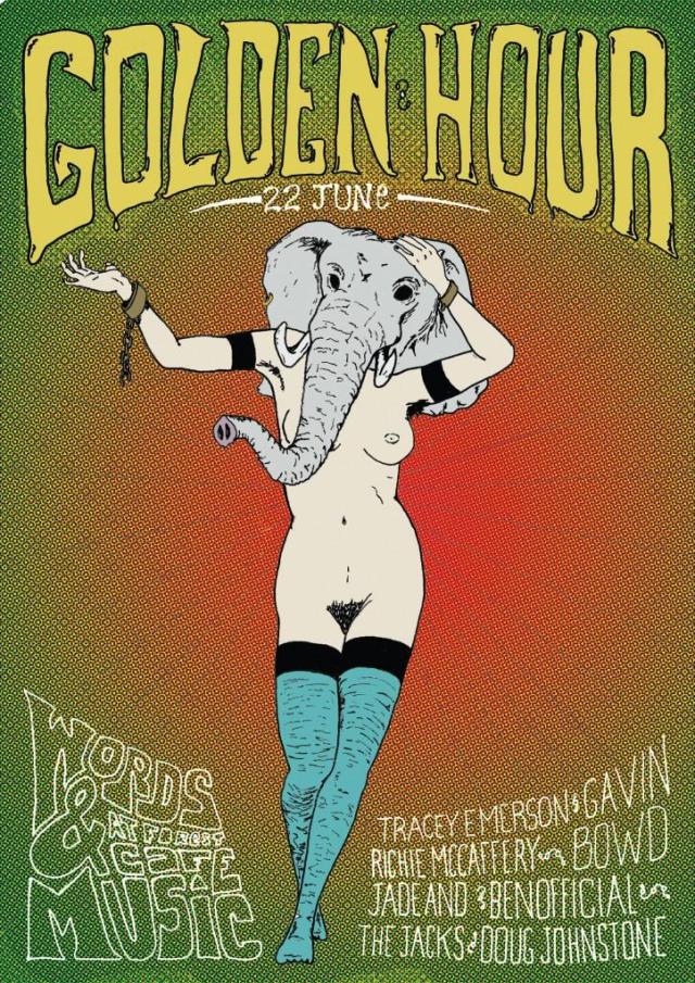 Ladies and gentlemen — join us for the first in the final trilogy of monthly Golden Hour Events. We promise the usual melange of zesty new words, honourable music and visual rubbish all in a beautiful space. Bring yourself. Bring friends. Bring booze. This is a night we can not prepare you for. Words from: Tracey Emerson (The Short-Story Doctor is In!), Richie McCaffrey (young poems with a familial lustre) & Gavin Bowd. With Music From: BenOfficial (electro art performance for which you are all woefully unprepared), Doug Johnstone (acoustic and solo and acoustic and alone), & Jade and the Jacks – Pure, relentless, funky fun. You will hot up.
