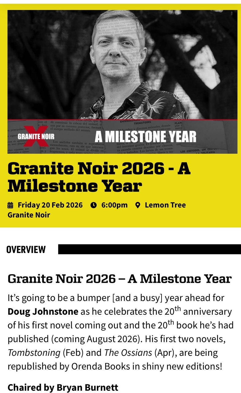 I’m thrilled to be appearing at next year’s Granite Noir, talking to Bryan Burnett about 20 years(!) as a published writer.