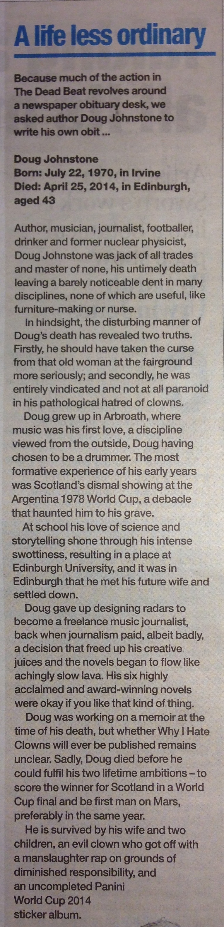 Here’s a big interview in The Scotsman , in which I mention Helen FitzGerald and Deliverance in the same sentence, and slag off my first two books. Oops.
